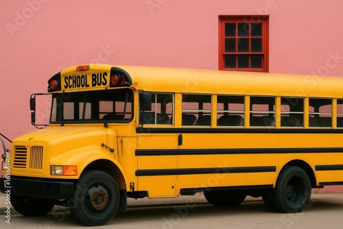 A classic yellow school bus stands ready against a vibrant pink backdrop, symbolizing the daily routine of students and the importance of education