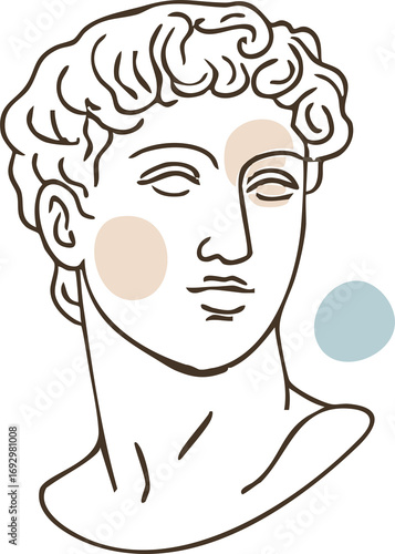a classical male bust with beige and blue abstract accents, combining traditional sculpture style with modern artistic simplicity.