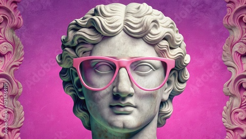 A classical sculpture wearing a pair of pink plastic framed glasses, framed by pink ornate design elements, against a vibrant magenta background.