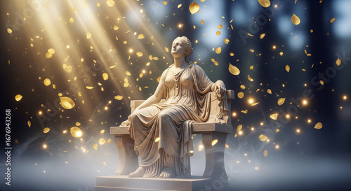 A classical statue of a woman sits peacefully, bathed in golden light, surrounded by falling petals.