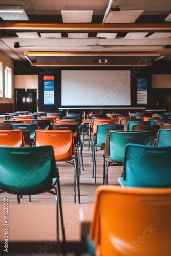 A classroom setting with colorful chairs and a projector screen for presentations.