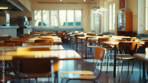 A classroom with many tables and chairs. Suitable for educational and training concepts