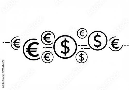 A clean and minimalist design featuring black-and-white icons of currency symbols, including the euro (€) and dollar ($) signs.