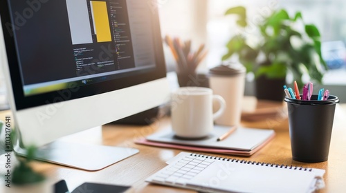 A clean and modern workspace with a computer, a coffee mug, notebooks, and colorful pencils.
