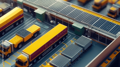 A clean energy-powered supply chain with electric trucks delivering goods.