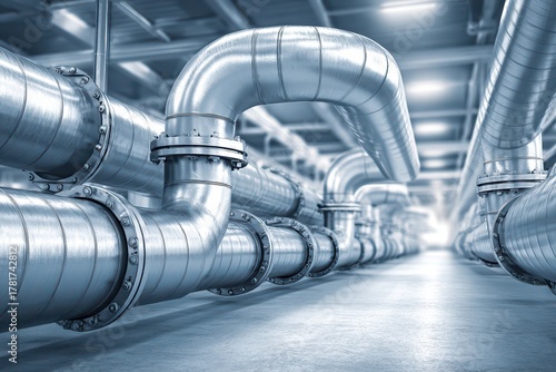 A clean, industrial view of parallel metal pipes and pipeline infrastructure, representing industry, construction and engineering, with silver color and structured design.