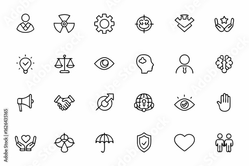 A clean, minimalist icon set representing foundational business principles. Ideal for corporate slides, mission statements, and leadership workshops