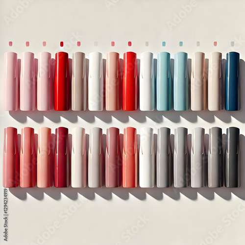A clean, minimalist illustration of nail polish swatches in various colors arranged in a row on a white isolated background, highlighting the versatility of nail designs.