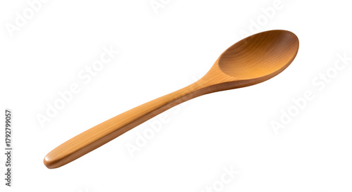 A clean, minimalistic image of a single wooden spoon placed diagonally on a pure white background