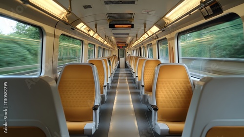 A clean, modern commuter train with wide aisles and luggage storage areas