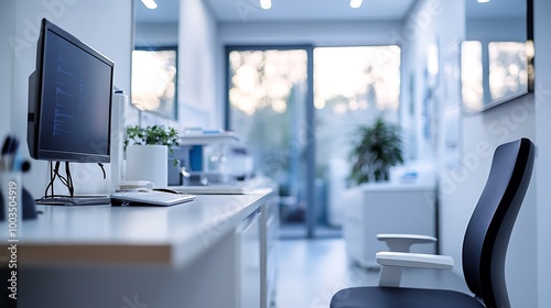 A clean, modern office space with a white desk, a computer monitor, a keyboard, and a black office chair. The office has large windows and a plant in a white pot.