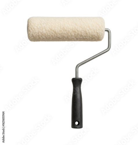 A clean, new paint roller with a thick, fluffy nap cover on a metal frame with a black handle, Isolated on Transparent and White Background