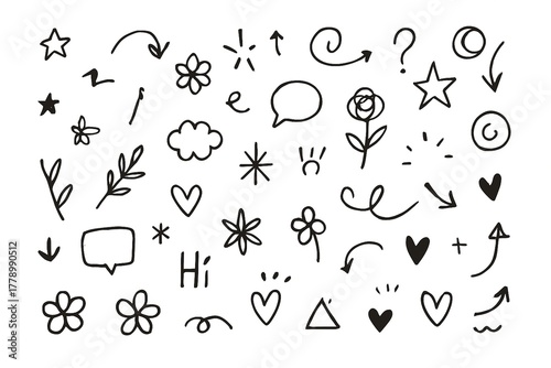 A clean vector illustration of various hand-drawn doodles and icons on a white background. The set includes arrows, stars, hearts, flowers, speech bubbles, and creative decorative elements. Perfect fo