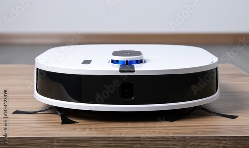 A clean white automatic robot vacuum cleaner on wooden surface