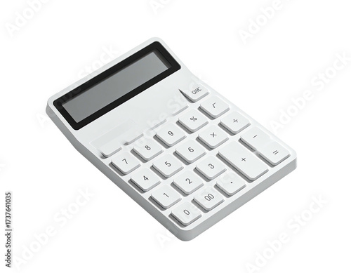 A clean, white calculator with a numeric keypad and digital display, angled up