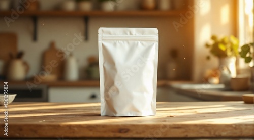 A clean white paper bag with a ziplock is placed on a wooden surface, with soft shadows enhancing its premium look.