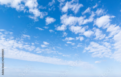 A clear blue sky filled with soft, fluffy clouds creates a serene atmosphere, ideal for various design projects or backgrounds in digital media.