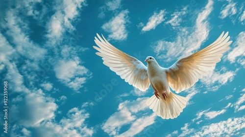 A clear blue sky with gentle, white clouds and a white dove spreading its wings wide