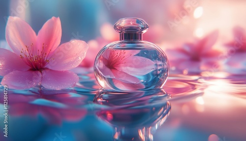 A clear bottle of floral scent rests amidst soft cherry blossoms on the water