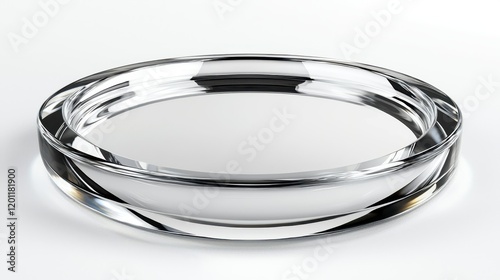 A clear, circular glass dish with a smooth surface, designed for serving or decorative purposes.