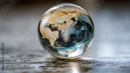 A clear crystal globe with a golden map of the world, placed on a reflective surface.