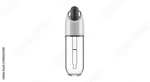 A clear glass bottle with a dropper inside and a white and gray top on a white background is centered ai generated