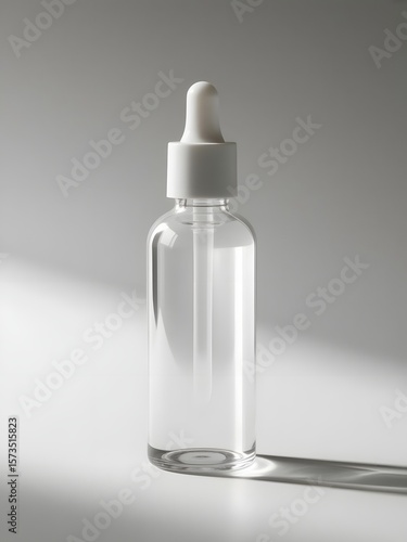 A clear glass bottle with a white dropper top sitting on a white surface with soft lighting and shadows