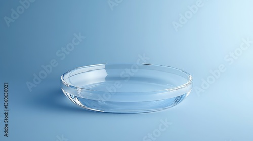 A clear glass bowl partially filled with water sits on a light blue surface against a matching background