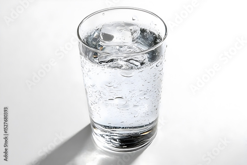 A clear glass filled with ice-cold water, showcasing condensation and bubbles.