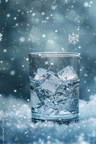 A clear glass holding icy water, surrounded by snowflakes gently falling against a soft, muted backdrop