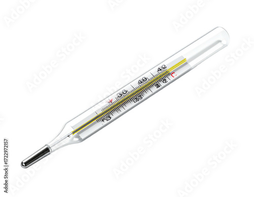 A clear glass medical thermometer, displaying a temperature reading, lies at an angle against a black background