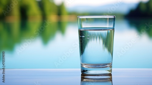A clear glass of water set on a reflective surface with a serene lake and green trees blurred in the background.