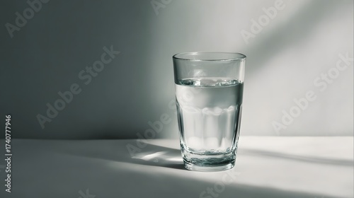 A clear glass of water sits on a white surface illuminated by studio light casting soft shadows