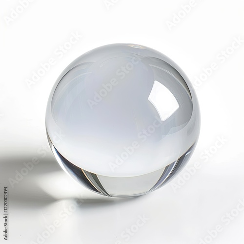 A clear glass sphere resting isolated on white background, reflecting light and creating shadows.