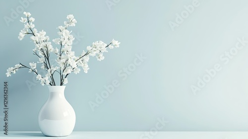A clear glass vase is filled with delicate white flowers and green stems,