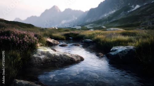 A clear mountain stream flows through a serene alpine meadow dotted with purple wildflowers and rocks