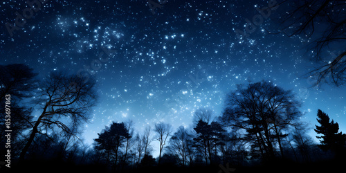 A clear night sky filled with stars and the Milky Way visible, with silhouettes of trees in the foreground