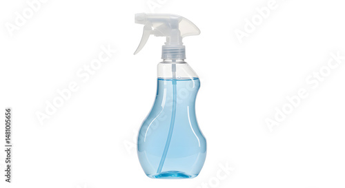 A clear spray bottle filled with blue liquid, positioned against a white background, ideal for cleaning and home care