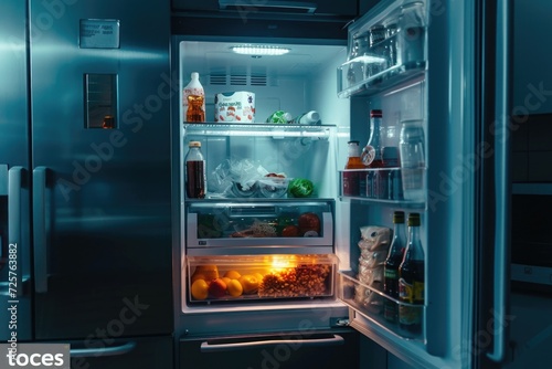 A clear view of an open refrigerator filled with various food items. Perfect for illustrating healthy eating, meal planning, or kitchen organization