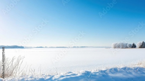 A clear winter sky above a snowcovered field, creating a bright, serene panoramic view
