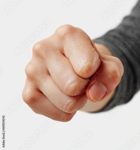 A clenched human fist faces forward, fingers curled tightly, against a bright white background, with a small portion of a grey sleeve visible