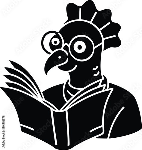 A clever rooster wearing glasses and reading a book in black and white silhouette