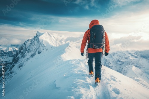 A climber ascends a snow-covered peak in winter mountains, showcasing breathtaking alpine scenery