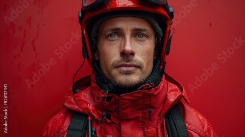 A climber in a red rain jacket and helmet stands against a vibrant red background, captured during a rainy day in a remote alpine area