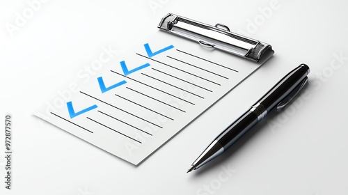 A clipboard with a checklist and a black pen on a clean white surface, ideal for planning and organization.