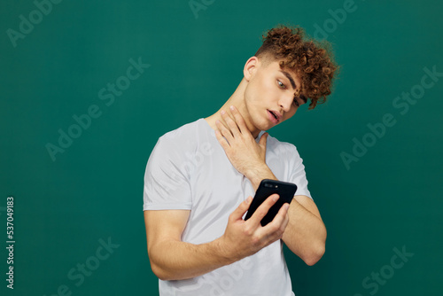 a close horizontal photo of a nice man standing with a smartphone, looking into it and holding his hand loosely around his neck