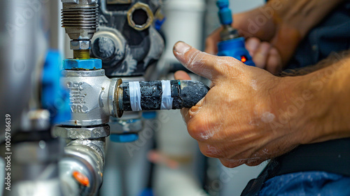 A close shot of a person applying thread seal tape to a pipe thread, preparing it for a plumbing repair.