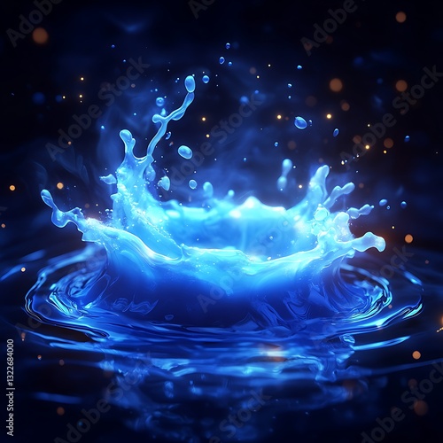 A close up of a blue water splash that is luminous