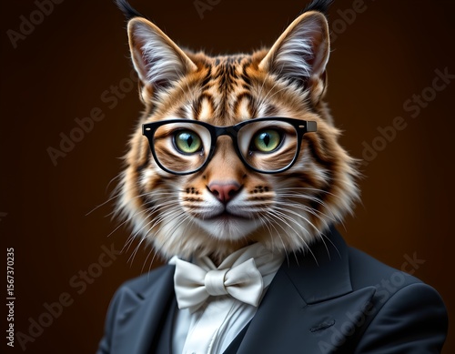 a close up of a cat wearing glasses and a bow tie, with its fur appearing to be digitally altered to mimic human skin