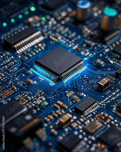 A close up of a computer chip with a blue glow
